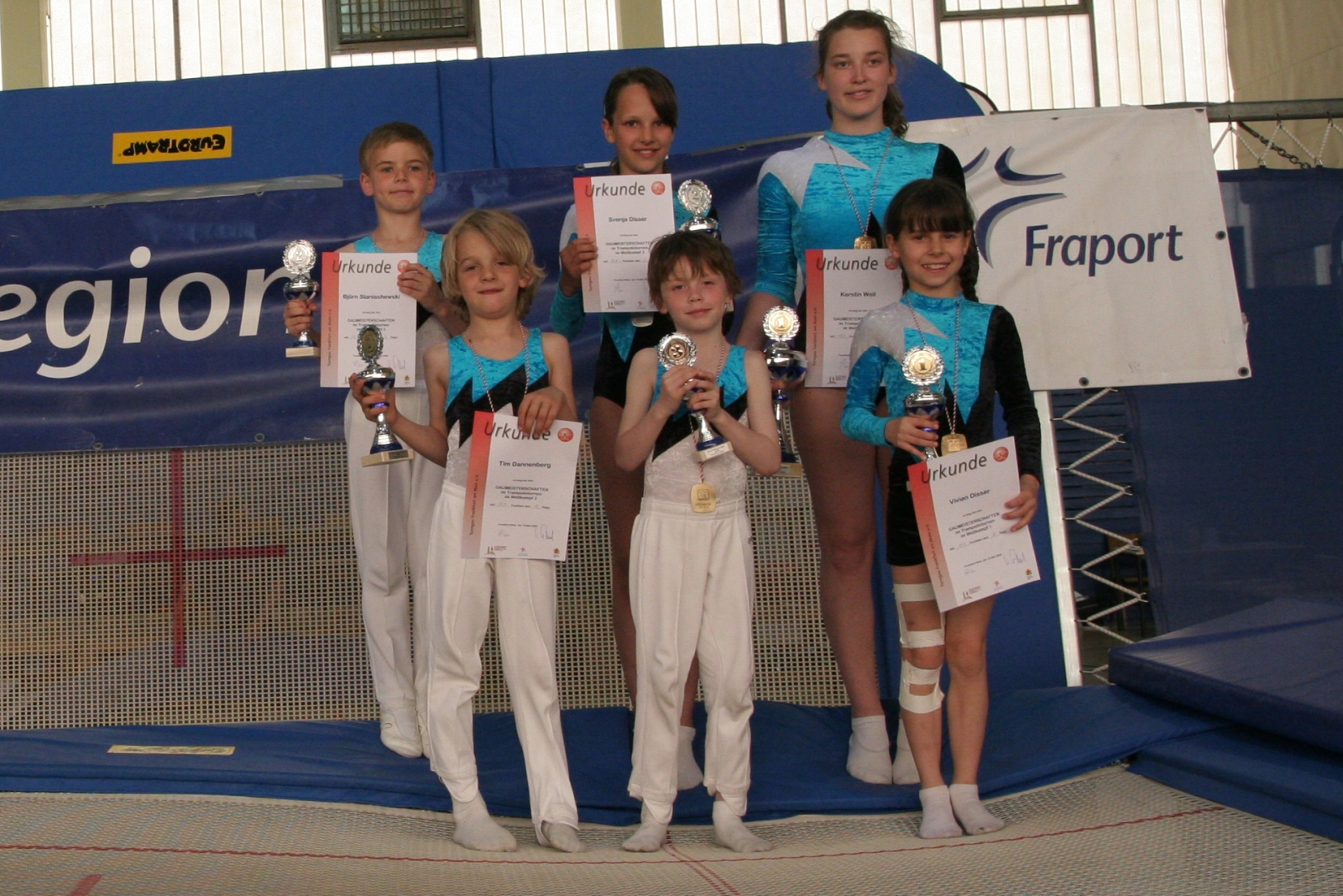 Den Titel der weiblichen Minis – Jahrgang 1997 und jünger – gewann Vivien Disser von der SG Nied mit 81,40 Punkten vor Christina Grüll von den Frankfurt FLYERS mit 79,60 Punkten. Die Klasse dieser beiden Turnerinnen unterstreicht der Abstand zur Drittplatzierten: Henriette Harbauer vom TSV Sachsenhausen kam auf 66,90 Punkten.
